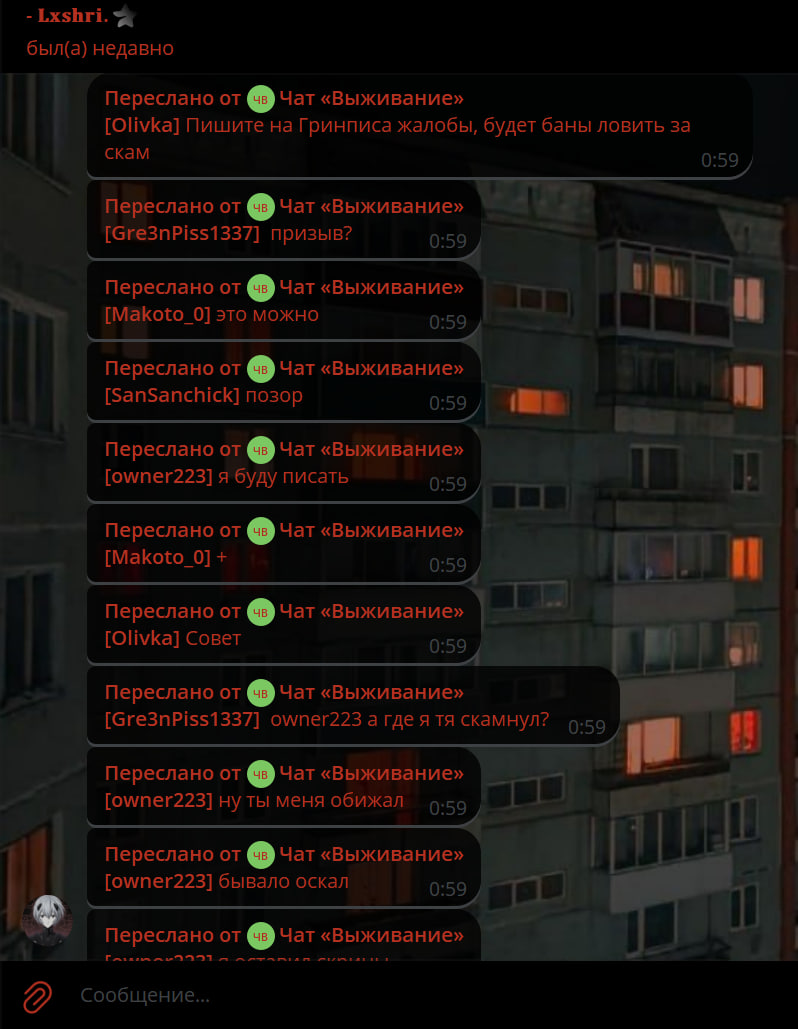 6. Подтверждение: В подтверждение прилагаю скриншот сообщений из чата, транслирующего игровой чат. Подтвердить происходящую ситуацию могут администраторы Оливка и decess.