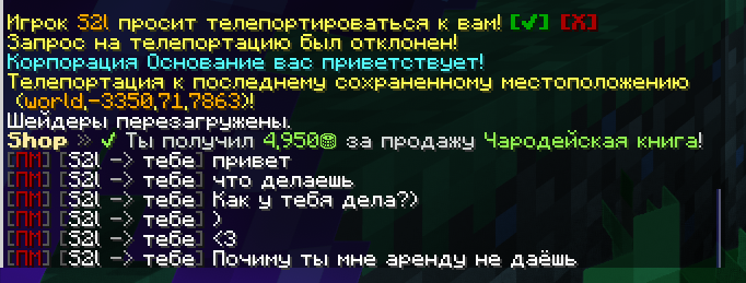 4. Что было нарушено: В честь своего ДР запустил ивент с поздравлениями, где нужно было поздравление в книге написать и потом получить арт + за лучшее поздравление доп приз. Стул начал саботировать в чате, требовать пруфов, что приз будет и достанется честно. Потом придя в мой магазин в войсе начал меня сравнивать с "зеленским", типа я нечестно буду оценивать и т.д. Он реально сравнил меня с "зеленским". Какие-то сны при 40 градусах... (свидетели werbot и неподалеку был охотник). Начал давать интервью верботу, где говорил, что вся экономика сервера держится на нем и его магазине, и что мы должны сказать спасибо ему за цену на порох в 500. Далее начал требовать чтобы я продал место ему в своем магазине, где он бы разместил табличку на свой варп. Также он начал высказываться "Вот вы продавали свои блоки и продавайте, нечего алмазами торговать", он продолжил говорить, что мы не имеем права торговать другими предметами кроме блоков. Он весь вечер меня доставал требованием продать ему место в моем магазине и рассказывать в войсе какой он весь из себя "классный". Далее он по всем варпам скупил товары и выставил у себя и начал рекламироваться "ой а у других нет в наличии приходите ко мне". Еще он на спавне на рынке купил 3 торговые точки и накидал там товарами, которые он у меня же купил. С рынком на спавне были свидетели дотори, облипиха и таликрал, которые тоже слышали все эти волшебные рассказы от стула. Также я забыл добавить, что для ивента своего выставил на ah несколько книг с пером за 50, чтобы больше желающих могли поучаствовать, но стул купил эти книги и начал пытаться дотори перепродать их за 5к.