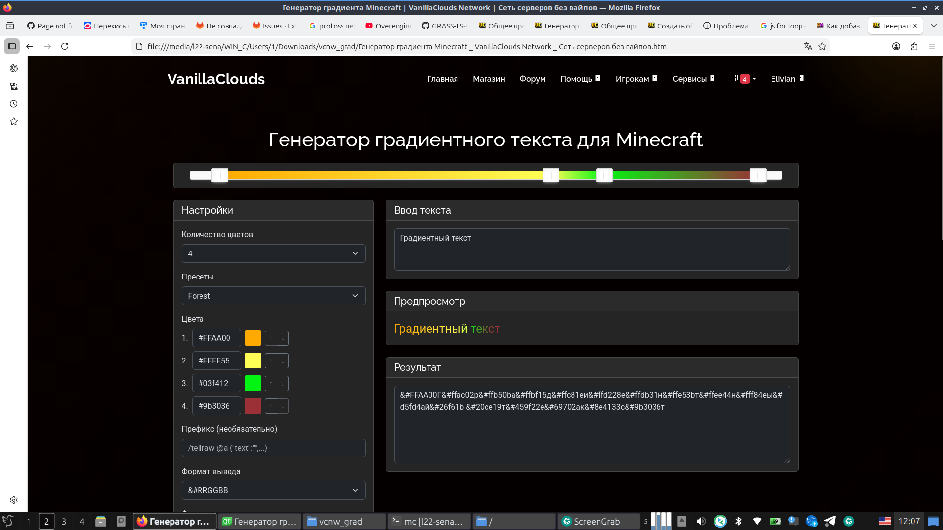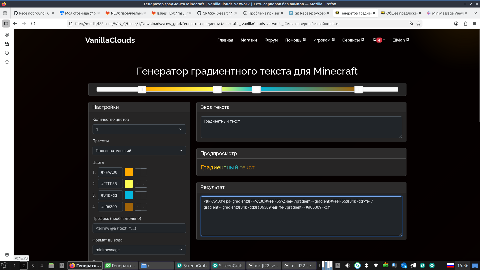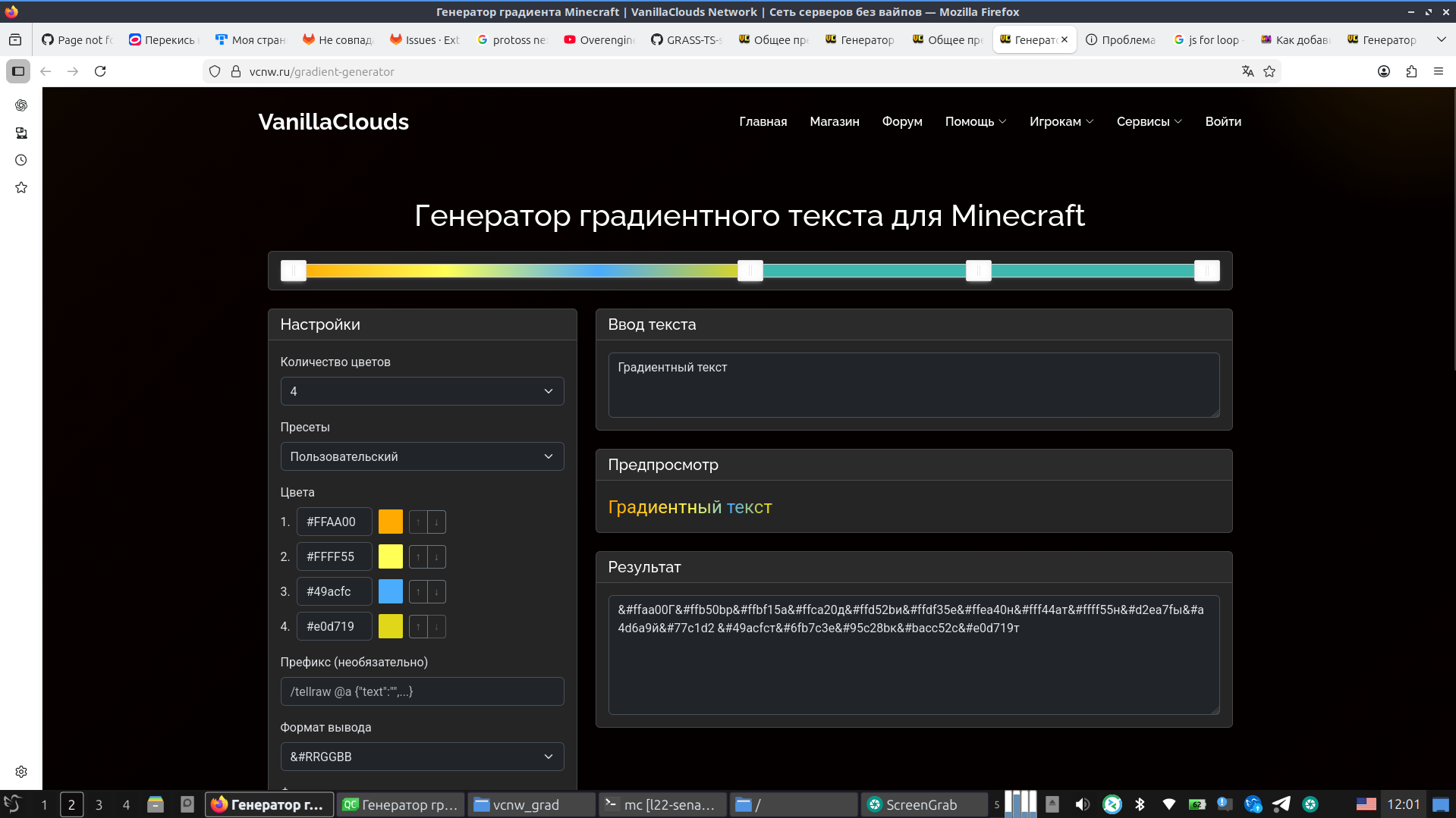 function generateMiniMessageFormat(text, prefix, formatting) { let result = prefix ? prefix : ''; ///воспроизведём выбор градиента из getGradientColor (плохо!) if (!slider || colors.length === 1) result += `<#${colors[0].substring(1)}>${text}`; else { let flagRightLimitReached = false;//проверка того, был ли сдвинут правый ползунок от края. Если да - не надо писать </gradient> в конце, потому что там уже будет не градиент, а монохромный текст let flagGradientUsed = false;//есть ли градиент, который можно закрывать <\gradient> let flagSkipAllRemains = false;//Если несколько конечних ползунков сдвинуты в точку const characters = Array.from(text); let current_segment=-1; const values = slider.get().map(parseFloat); if(values[0] != 0) result += `<#${colors[0].substring(1)}>` for(let i=0; i < characters.length; ++i) { const position = characters.length > 1 ? i / (characters.length - 1) : 0; if(current_segment < values.length-2 && !flagSkipAllRemains) { if(position >= values[current_segment+1]) { while(position >= values[current_segment+1])//чтобы не возникали "склейки", когда ползунки сдвинуты в точку и в блоке <gradient>...</gradient> не оказывается ни одного символа { current_segment++; if(current_segment >= values.length-1) { flagSkipAllRemains = true; break; } } if(!flagSkipAllRemains) { current_segment--; if(flagGradientUsed) result += `</gradient>`; colorStops=`${colors[current_segment+1]}:${colors[current_segment+2]}` result+=`<gradient:${colorStops}>` flagGradientUsed = true; current_segment++; } } } else if( (position > values[values.length-1]) && !flagRightLimitReached) { flagRightLimitReached = true; if(flagGradientUsed) result += `</gradient>`; result += `<${colors[colors.length-1]}>`; } result+=characters[i]; } if(!flagRightLimitReached) result += `</gradient>`; } ///----конец логически копированного кода----- const formatTags = []; if (formatting.bold) formatTags.push('bold'); if (formatting.italic) formatTags.push('italic'); if (formatting.underlined) formatTags.push('underlined'); if (formatting.strikethrough) formatTags.push('strikethrough'); if (formatting.obfuscated) formatTags.push('obfuscated'); if (formatTags.length > 0) { result = `<${formatTags.join(',')}>${result}</${formatTags.join(',')}>`; } return result; }В ней довольно много странного кода, который отвечает за не-добавление лишних <gradient></gradient> на 0 символов - чтобы было компактнее - типа таких случаев